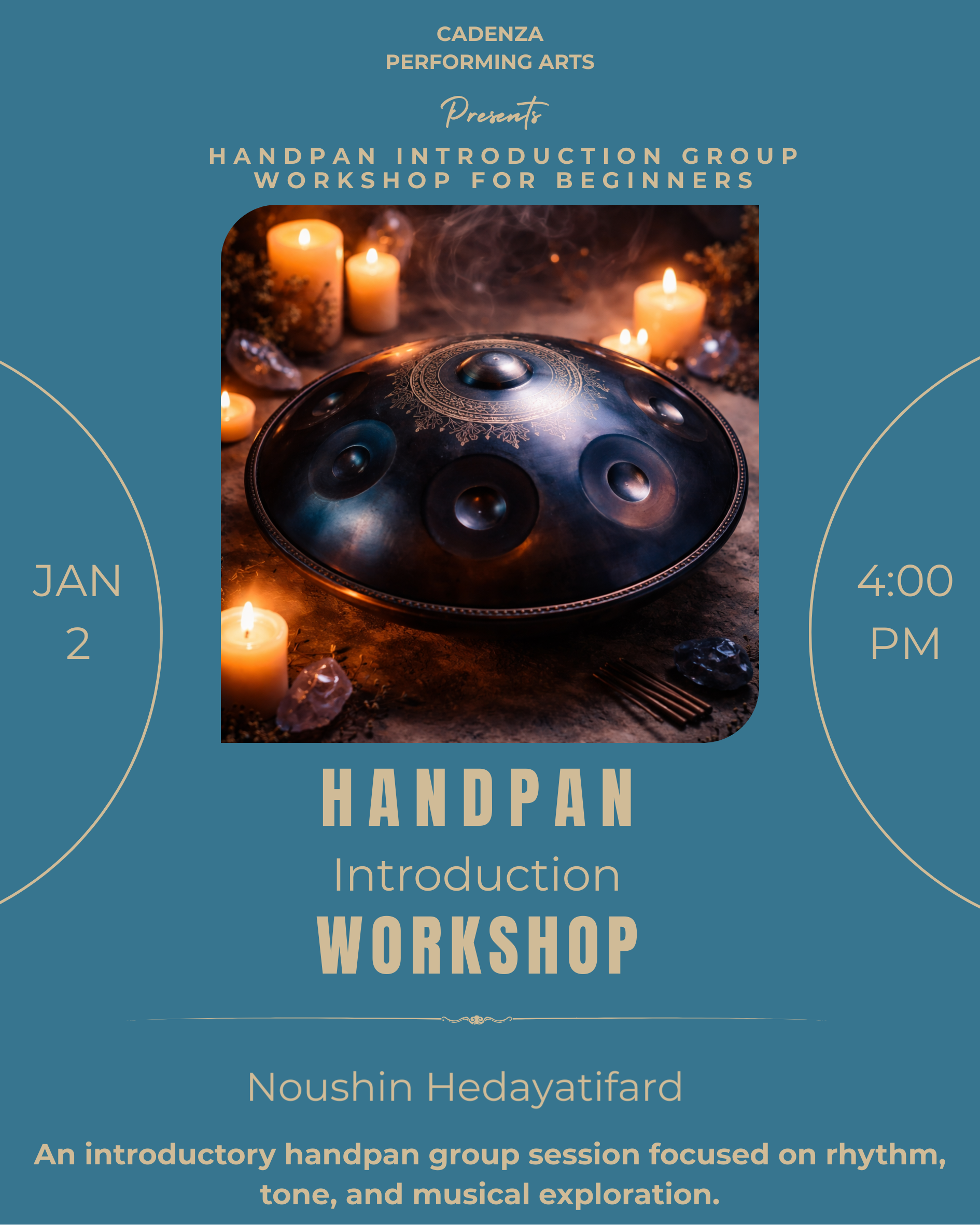 Discover the unique, meditative sound of the handpan in this introductory group workshop designed for beginners and music enthusiasts of all backgrounds. Led by Noushin Hedayatifard, an experienced multi-instrumentalist and educator, this session offers a welcoming and inspiring introduction to handpan technique, rhythm, and musical expression.